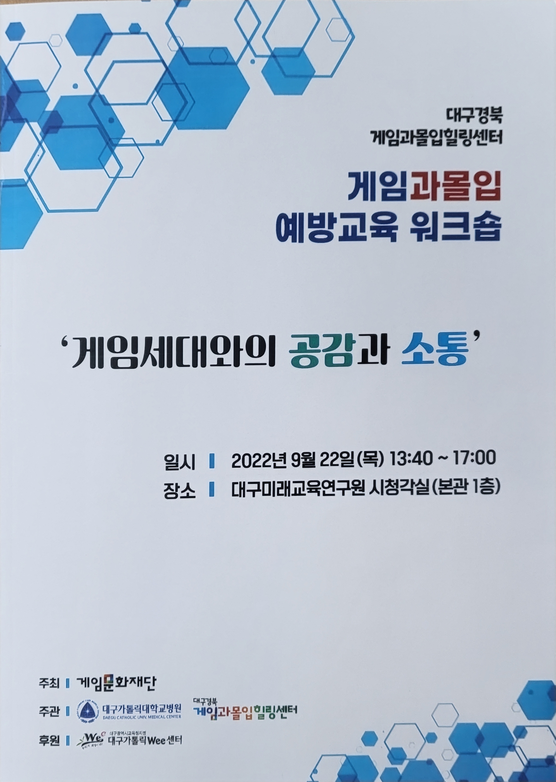 '게임세대와의 공감과 소통' 학교에서 학생들을 상담하다 보면 게임으로 인하여 힘들어하는 학생과 학부모님을 만나게 되는데 이번 워크숍 제목은 나를 충분히 과몰입하도록 만드는데 성공을 한 것 같다는 생각을 해 봅니다.