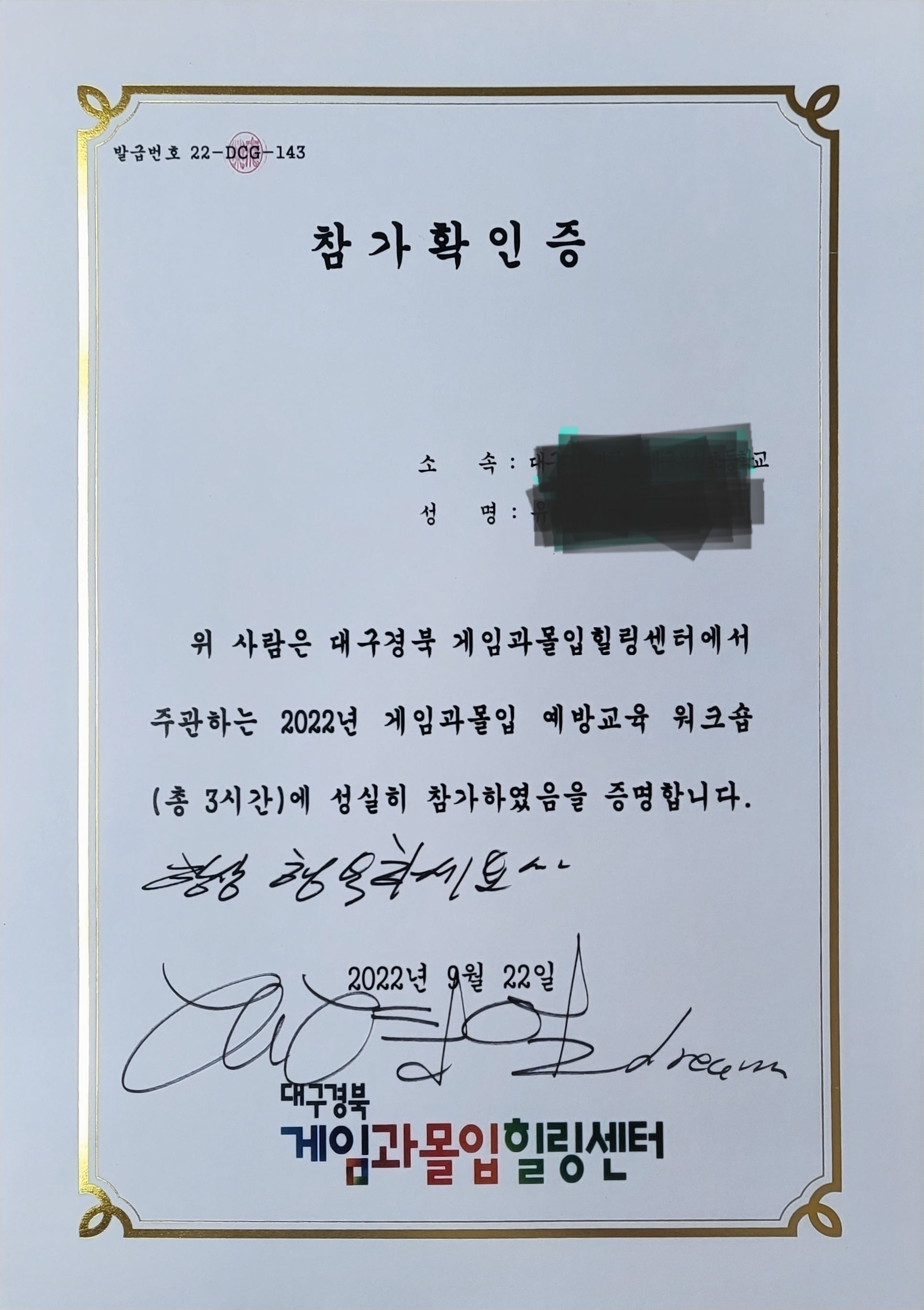 워크숍을 마치고 교수님의 친필 사인을 받은 참가 확인증도 받았습니다.