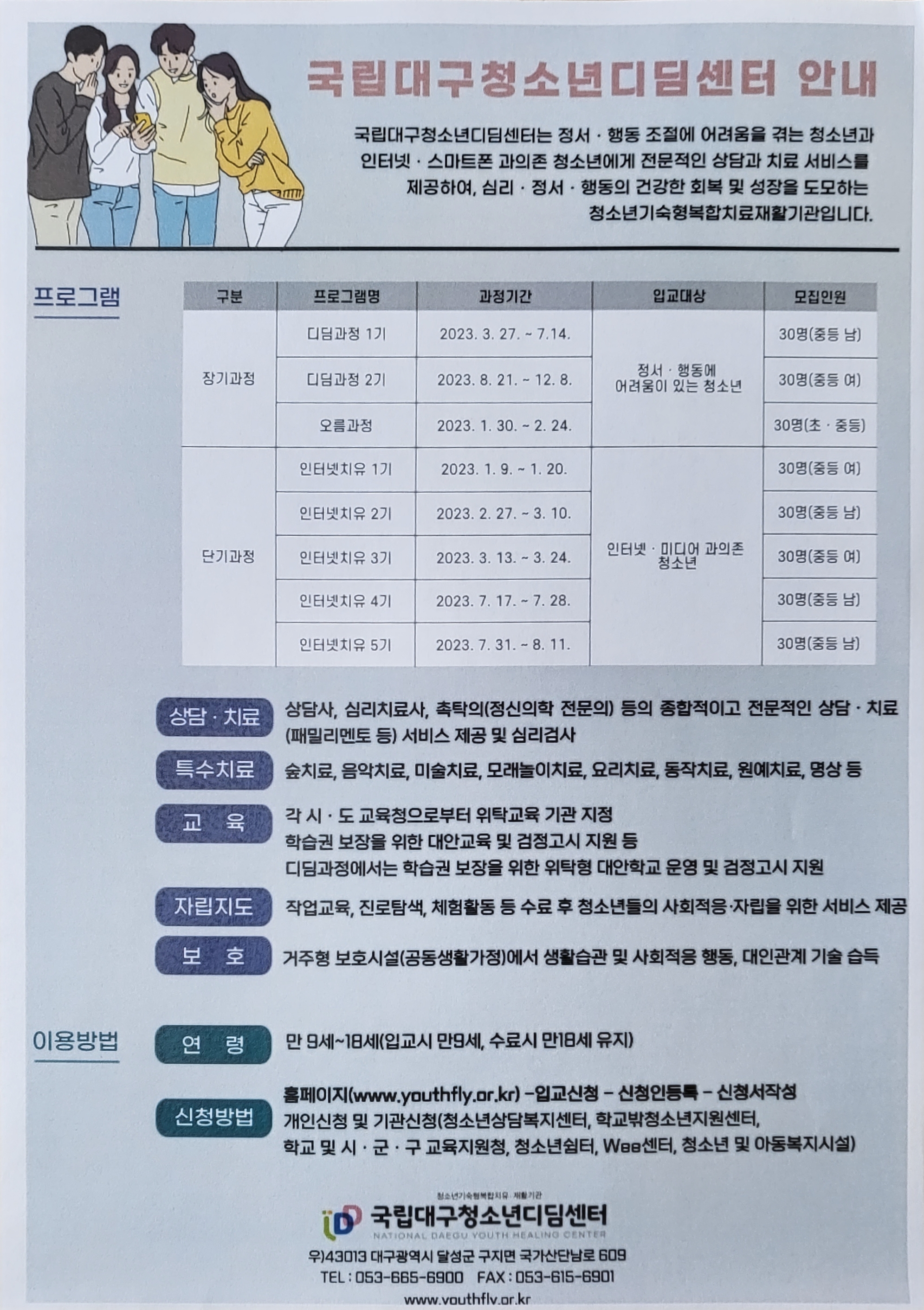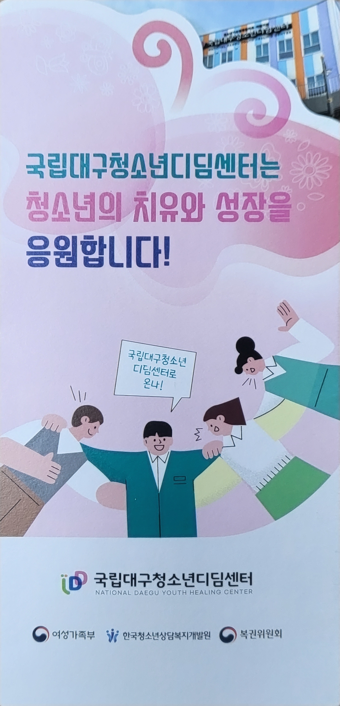 대구에 있는 국립 대구 청소년 디딤센터에서 다양한 프로그램을 통하여 사회 여러 곳에서 어려움을 느끼는 청소년들의 성장과 치유 및 회복을 지원하는 청소년 기숙형 복합 재활 기관입니다.