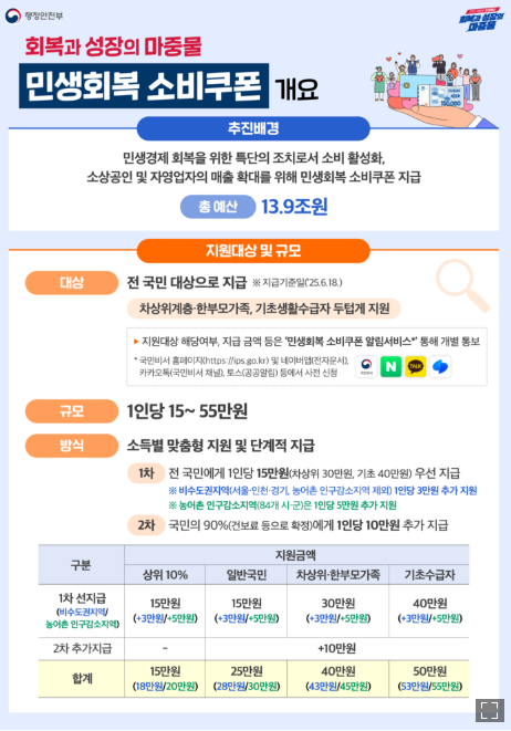정부는 5일 정부서울청사에서 관계부처 합동 브리핑을 개최하고 ‘민생회복 소비쿠폰 1차 지급계획’을 발표했습니다.