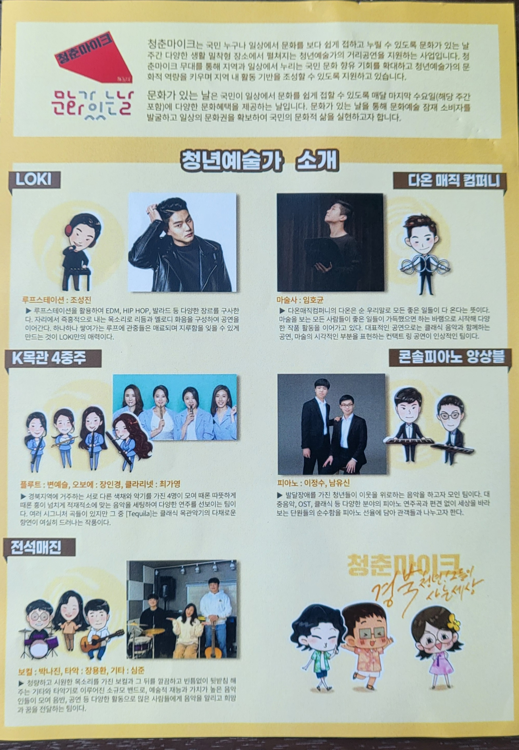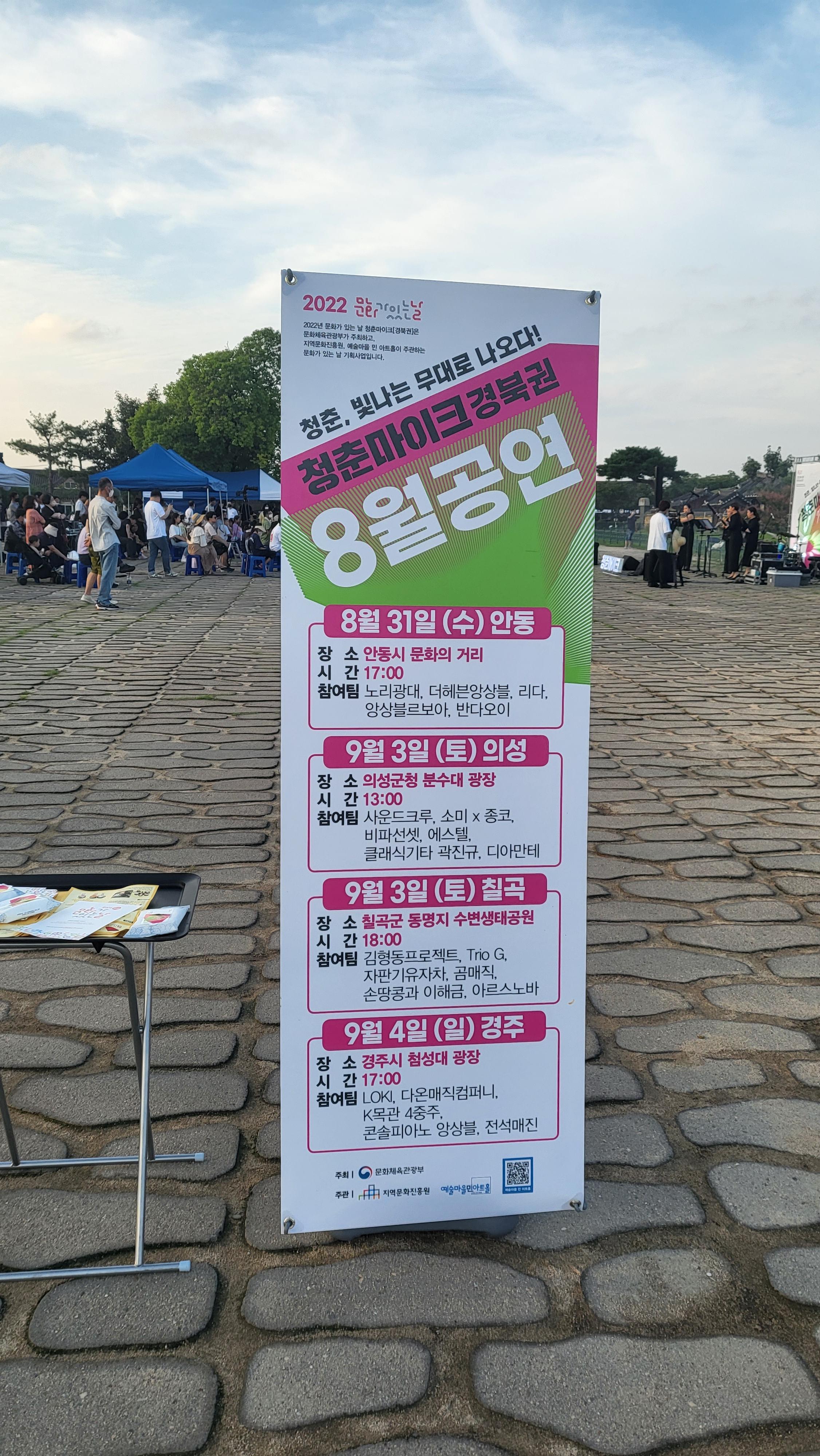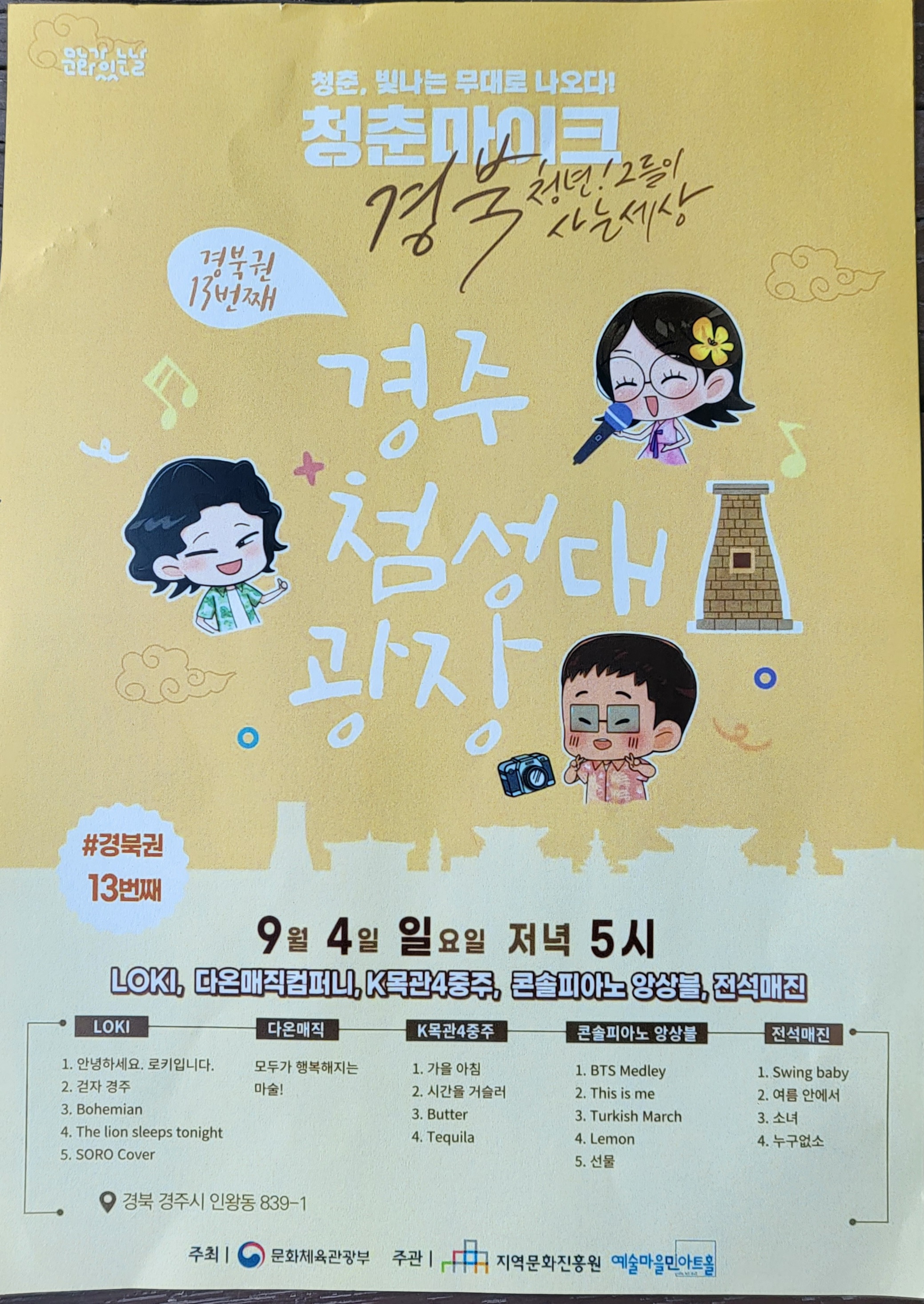 9월 4일 일요일 저녁 5시 첨성대 광장에서 청춘, 빛나는 무대로 나오다! 청춘 마이크 청년 예술가들입니다.