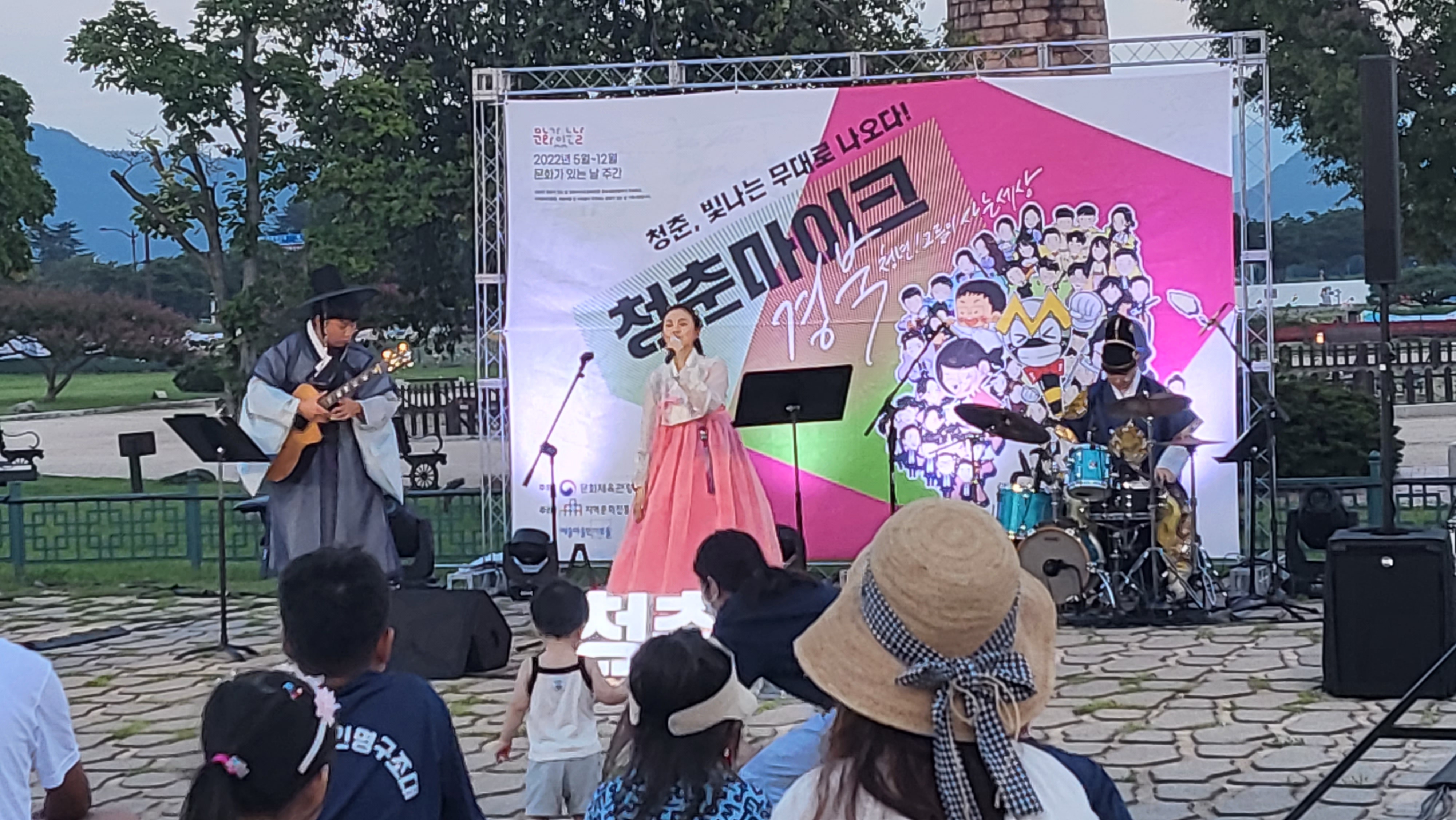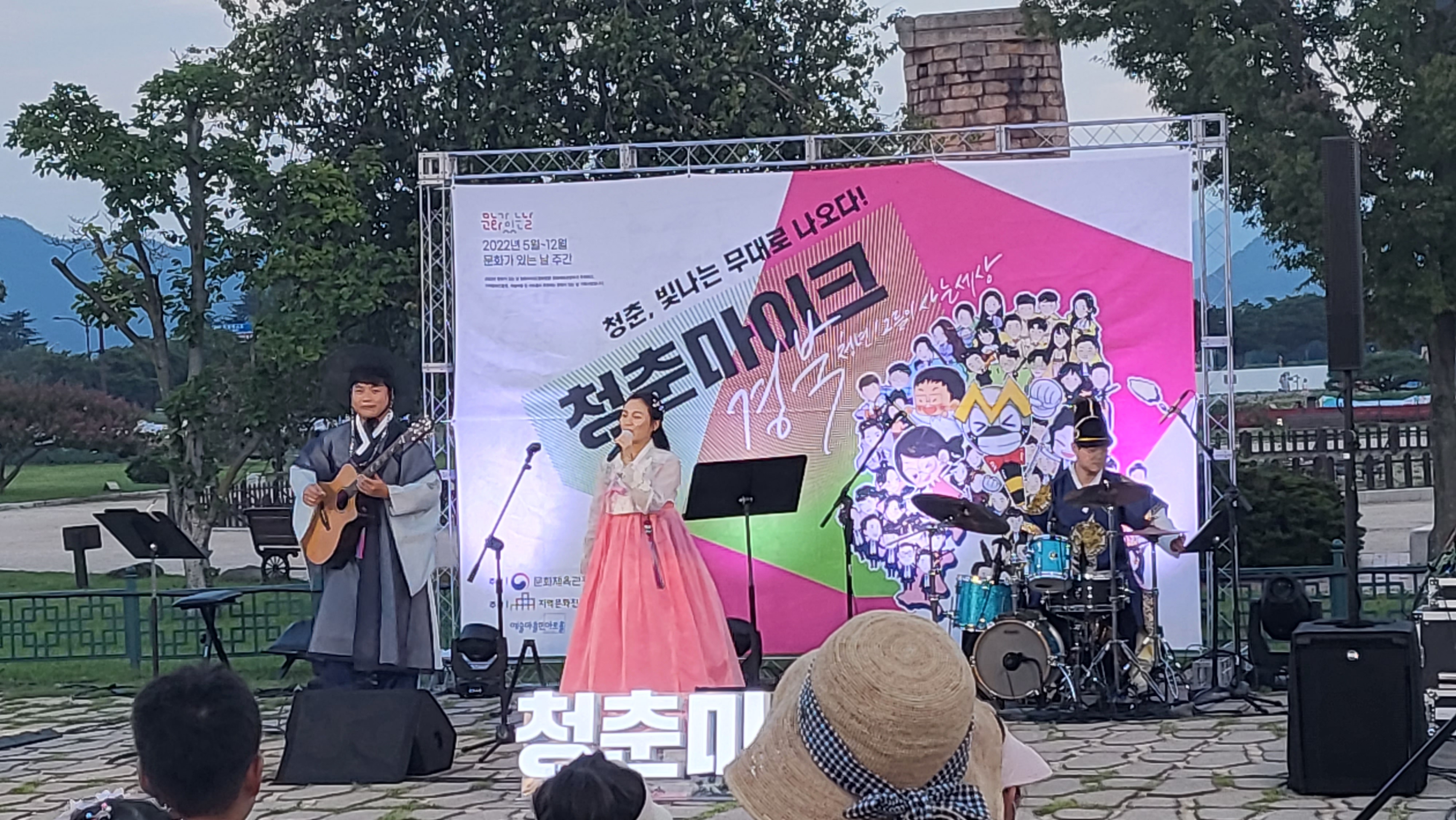 일상의 쉼표가 있는 문화의 날 '청년 마이크'가 진행되고 있어 그곳에서 발걸음을 멈추고 행사가 끝날 때까지 혼연의 일체가 되어 음악에 취해보았습니다. 여러 가지 다채롭고 흥미로운 프로그램들로 관객들이 앞에 놓아둔 60개의 파란 의자가 전석 매진을 이룰 정도였습니다.