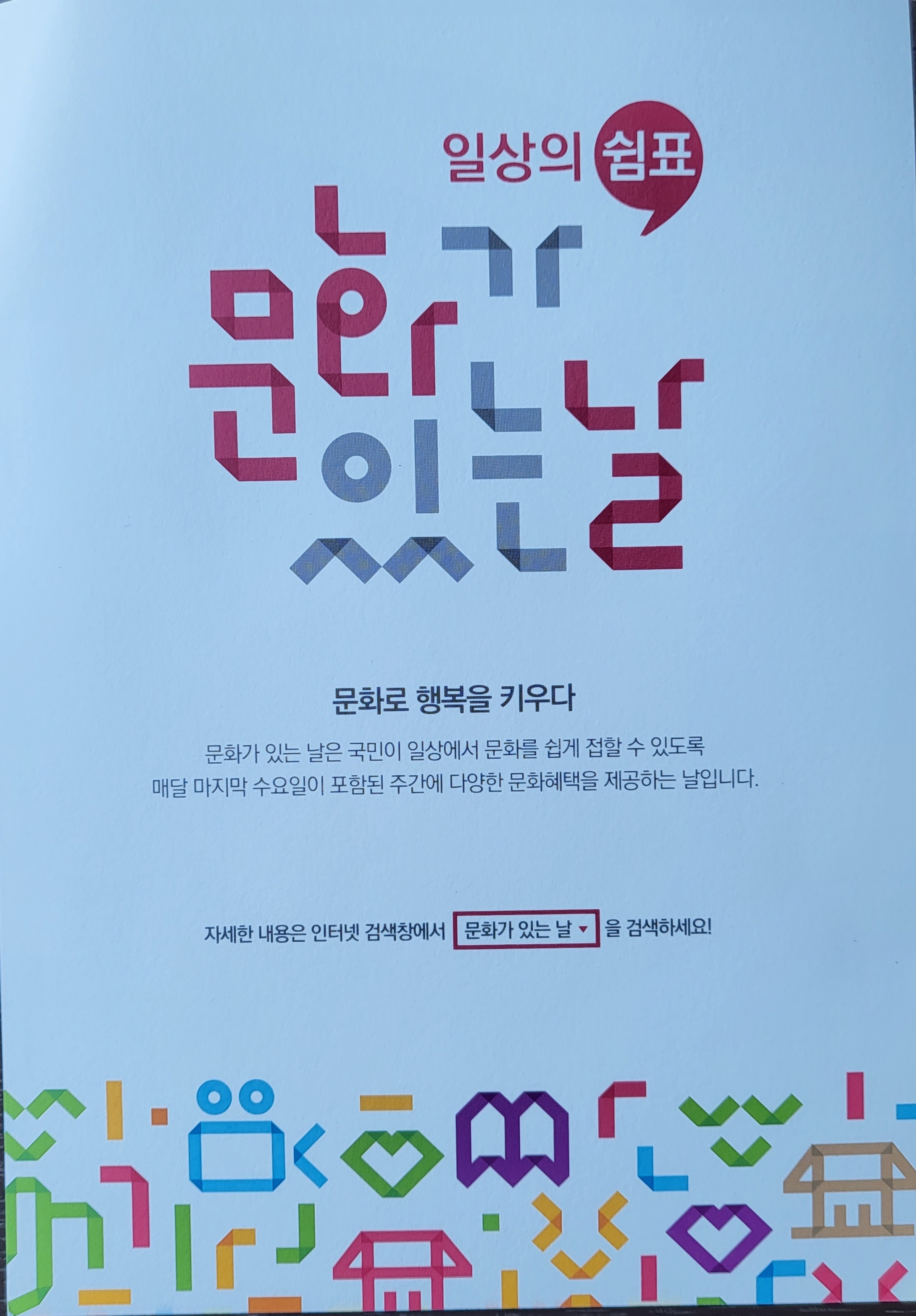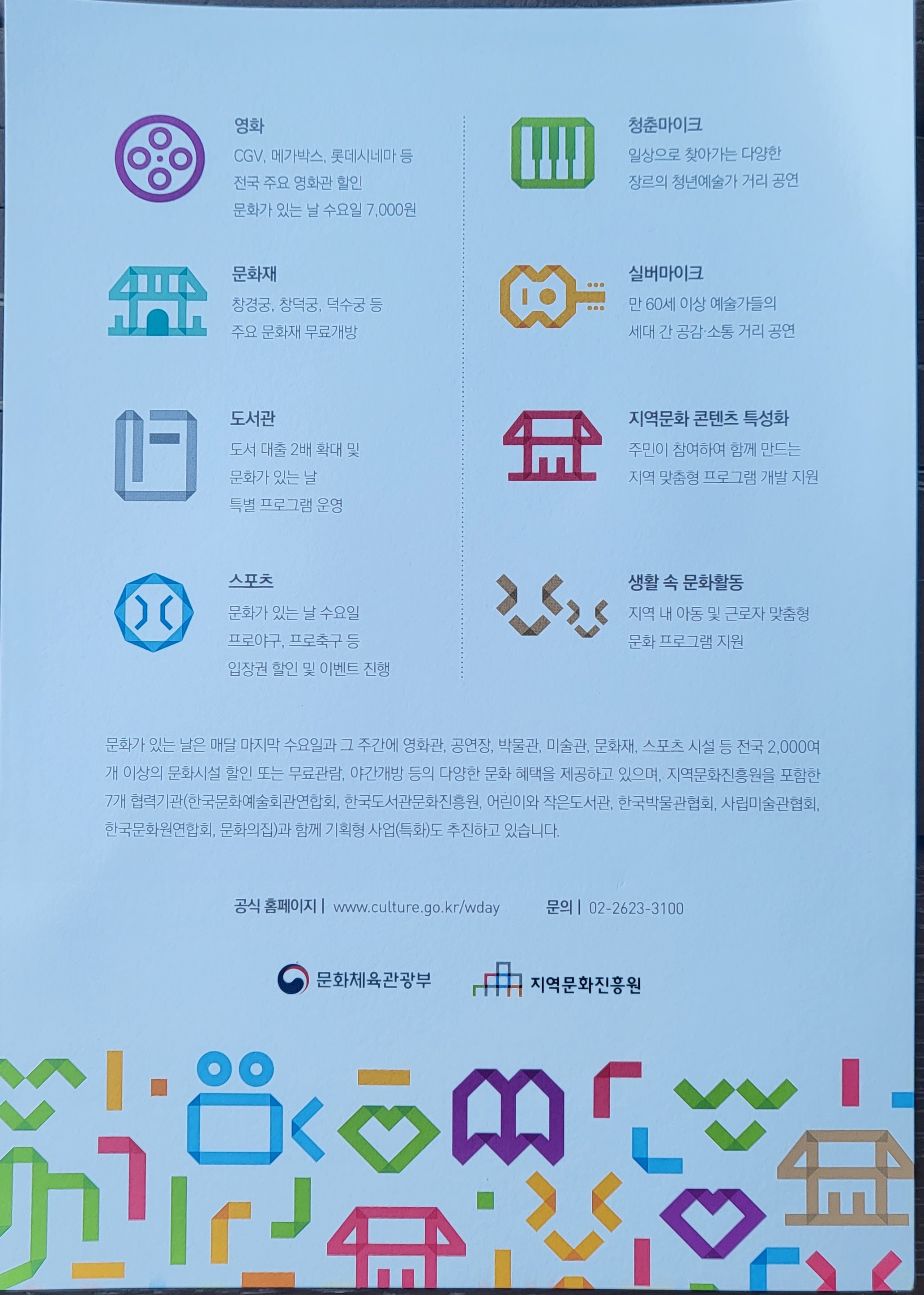 문화가 있는 날은 국민이 일상에서 문화를 쉽게 접할 수 있도록 배달 마지막 수요일 (해당 주간 포함)에 다양한 문화혜택을 제공하는 날입니다.